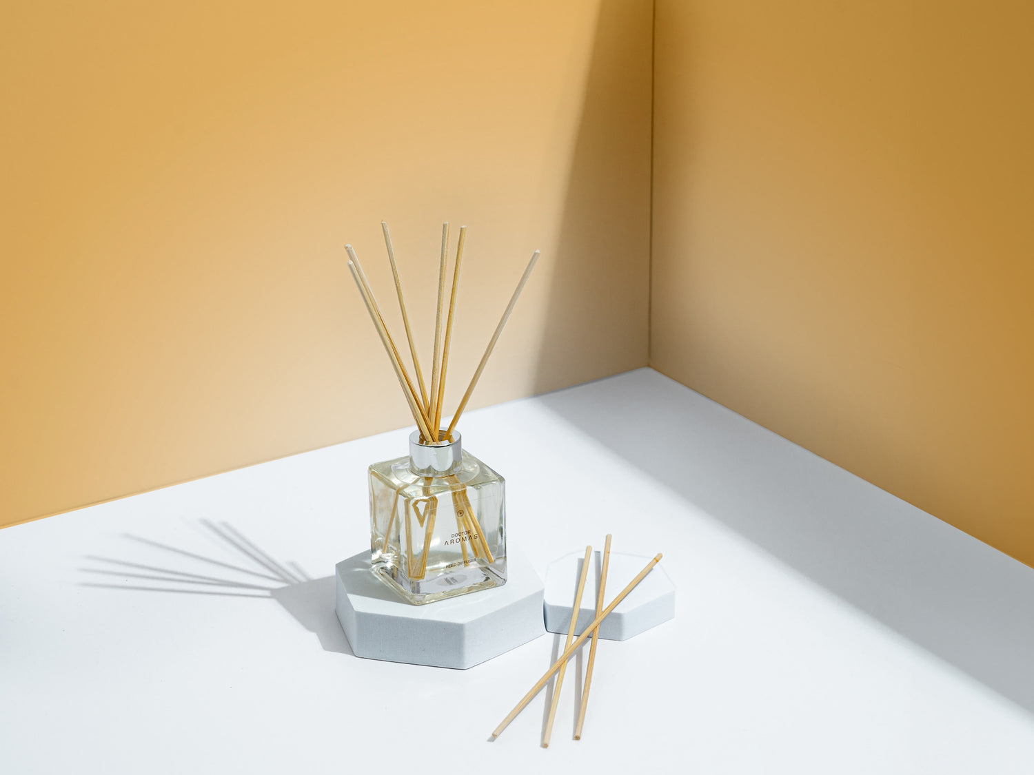 Glass jar filled with the finest cosmetic-grade perfume and a handful of bamboo reeds that delivers an uninterrupted aura of scent.
